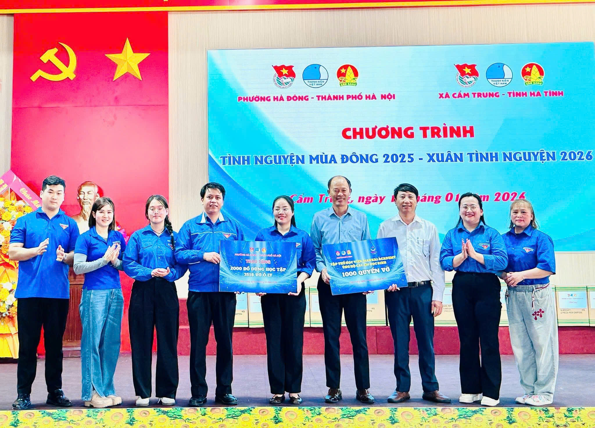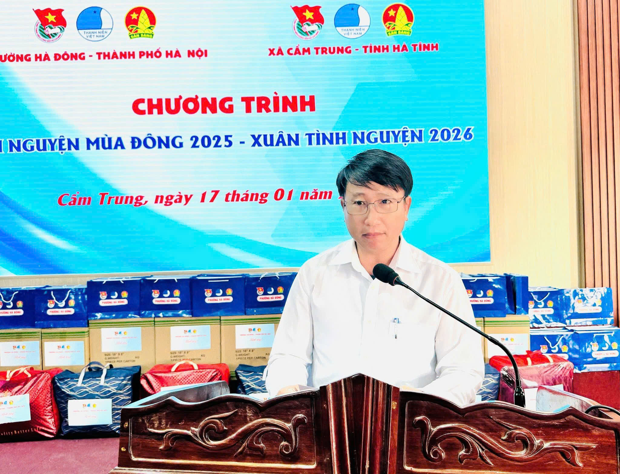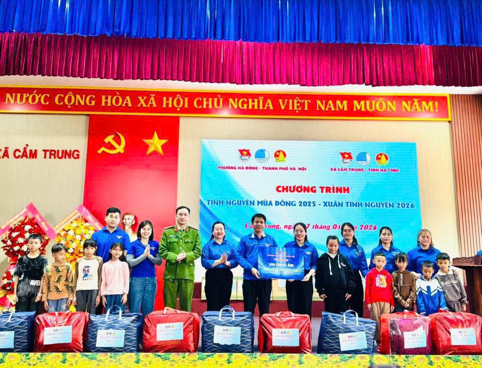 Thực hiện Chương trình công tác Đoàn và phong trào thanh thiếu nhi năm 2026, sáng ngày 17/ 1/2026, Ban Thường vụ Đoàn xã Cẩm Trung, tỉnh Hà Tĩnh phối hợp với Đoàn phường Hà Đông, thành phố Hà Nội tổ chức Chương trình “Tình nguyện mùa Đông năm 2025 – Xuân Tình nguyện năm 2026” trên địa bàn xã Cẩm Trung. Tham dự chương trình, về phía Đoàn phường Hà Đông có đồng chí Nguyễn Tiến Phúc – Ủy viên Ban Chấp hành Thành đoàn Hà Nội, Phó Chủ tịch Ủy ban MTTQ Việt Nam phường, Bí thư Đoàn Thanh niên, Chủ tịch Hội đồng Đội phường; đồng chí Đỗ Thùy Linh – Phó Bí thư Đoàn Thanh niên, Phó Chủ tịch Hội đồng Đội phường; đồng chí Nguyễn Hoàng Lợi – Phó Bí thư Đoàn Thanh niên, Chủ tịch Hội Liên hiệp Thanh niên phường Hà Đông. Về phía địa phương có đồng chí Nguyễn Văn Tiến – Ủy viên Ban Thường vụ Đảng ủy, Phó Chủ tịch UBND xã; đồng chí Bùi Xuân Định – Ủy viên Ban Thường vụ Đảng ủy, Chủ tịch Ủy ban MTTQ Việt Nam xã Cẩm Trung; cùng các đồng chí Bí thư, Phó Bí thư Chi đoàn trên địa bàn toàn xã, đại diện các hộ gia đình và các em học sinh được nhận quà trong đợt này.